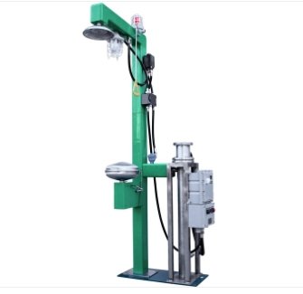 ②进水口处装有流量报警阀,在产品顶部配有防爆型声光报警器。一旦有使用者开动洗眼器,